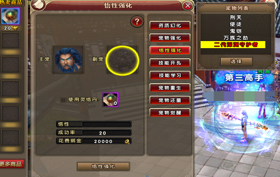 悟性强化可以替换更高的悟性值1,将需要提升悟性的宠物放入主宠栏。2、将悟性较高的同种类宠物放入副宠栏。3,使用明悟丹后,悟性强化的成功率将提升至100%!